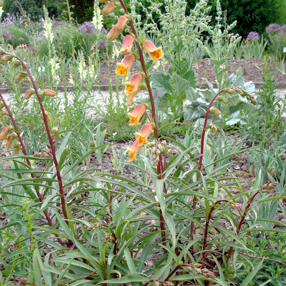 La floraison de la DIGITALIS obscura a un coloris original, ses fleurs tubulaires sont orange foncé, bordé de jaune, et la gorge est veinée de rouge brun. Digitale vivace.