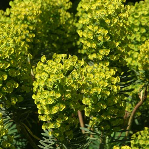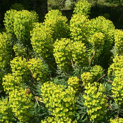L'EUPHORBIA characias ssp. wulfenii 'Shorty' pousse en touffe compacte de feuillage vert bleuté prenant des teintes rouge pourpre durant l'hiver. Cette variété fleurit en grappe jaune, en avril-mai et atteint une hauteur de 50 cm.