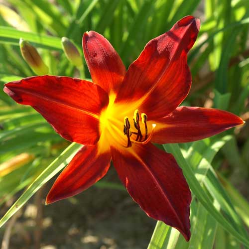 Très connue pour sa robustesse, l'Hémérocalle est d'une rusticité à toute épreuve et figure parmi les plantes vivaces à la plus grande longévité. Souvent recommandée en sol sec où elle résiste bien, c'est en sol frais que cette plante vivace atteint sa pleine beauté. Petites fleurs rouge carminé.