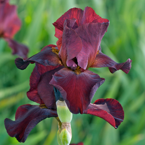 Ce sont les plus hauts et les plus tardifs. Ils sont issus des Iris germanica, pallida, vaariegata, mesopotamica, etc..., et font l'objet d'incessantes et nombreuses améliorations. Le choix des couleurs est immense, (H) Hâtif - (M) Mi-saison - (T) Tardif. Fleurs pourpres à bordeaux très velouté. Petites stries au coeur et barbe cuivrées.(M)