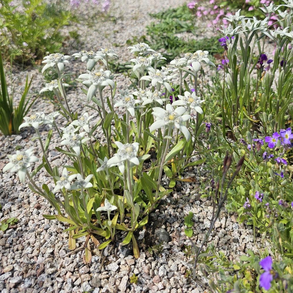 Vous connaissez la chanson 'étoile des neiges mon coeur amoureux' et bien le LEONTOPODIUM alpinum porte bien son nom. En effet comment ne pas tomber amoureux de cette plante mythique des alpes connue sous les noms vernaculaires de Edelweiss ou étoile des neiges. Plante vivace herbacée de culture facile, son feuillage est vert grisâtre et les inflorescences sont laineuses, argentées à coeur crème. Dommage qu'elle est devenue si rare dans les alpes, alors pour la contempler, n'hésiter pas à la planter dans votre jardin, Veiller à éviter les excès d'humidité durant l'hiver. Les fleurs peuvent se conserver séchées.