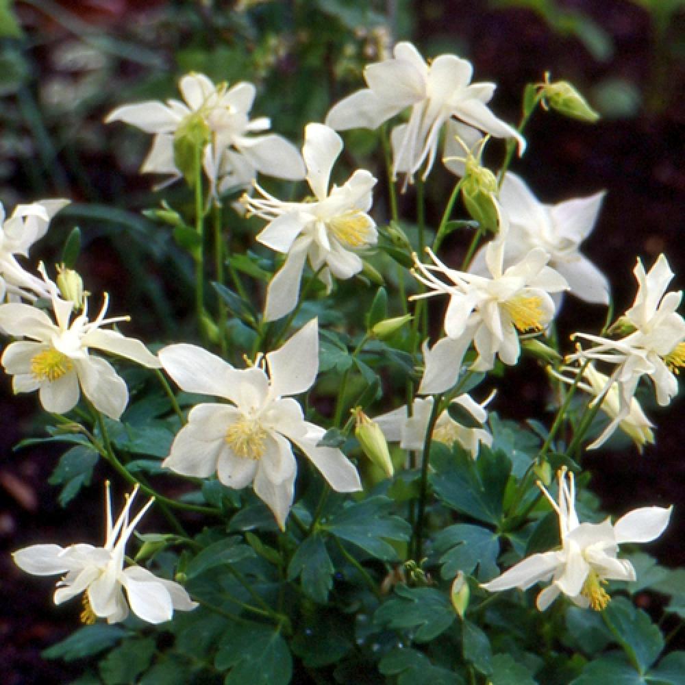 L'AQUILEGIA 'Kristall' offre au printemps, une floraison à grandes fleurs blanc pur et longs éperons.