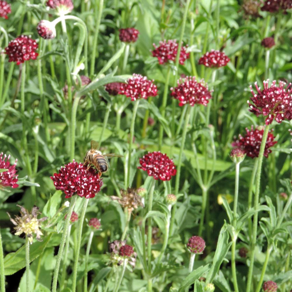 SCABIOSA atropurpurea 'Chile Black' est une plante vivace cultivée pour ses fleurs rouge foncé, d'une intensité extraordinaire. Cette vivace est d'une floribondité incroyable, et seul l'hiver peut l'empêcher de fleurir. Ses fleurs en boules ressemblent à des pompons ponctués de points blancs correspondant aux étamines. Excellente tenue des fleurs coupées en vase.