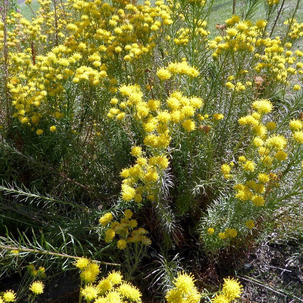 Aster doré. Port dressé. Petites feuilles étroites. Fleurs jaune d'or en pompons sans ligule. Sol sec et caillouteux.