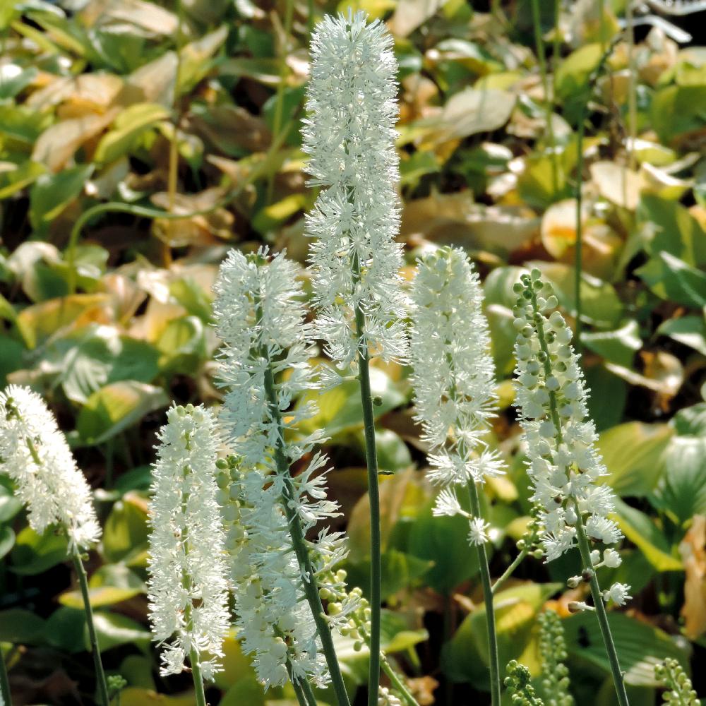 Floraison tardive pour L'ACTAEA simplex 'White Pearl' en épis denses composés d' une multitude de petites fleurs étoilées, très parfumées, blanc pur.