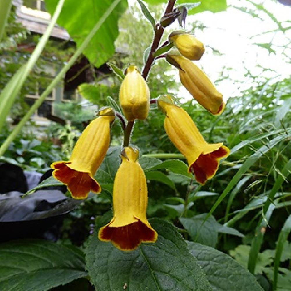 Couvre-sol au style exotique. Feuillage luxuriant, vert. Feuilles irrégulièrement dentées. Grandes fleurs tubulaires jaune à gorge rouge.