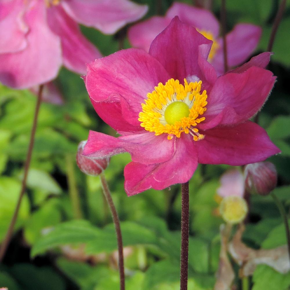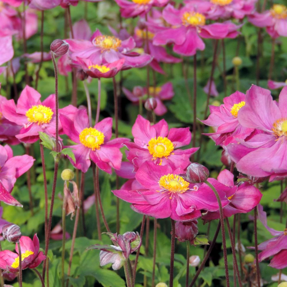 L’ANEMONE hupehensis 'Ariel' est une anémone du Japon incroyablement lumineuse grâce à ses grandes fleurs simples rose magenta, à cœurs jaune doré. Son feuillage vert foncé, très découpé, émerge en Avril et forme une touffe compacte arrondie, idéale en pots, autant qu’en massif. Elle colore joyeusement le jardin en fin d’été tout en nourrissant les insectes. Ses longues tiges fleuries sont aussi élégantes dans la brise automnale que dans un vase en centre de table. Elle apprécie les situations ensoleillé ou à mi-ombre, dans un sol frais.