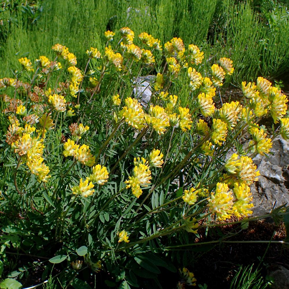 L'ANTHYLLIS vulneraria produit des bouquets de fleurs jaunes aux calices cotonneux. Sa floraison fait penser à celle d'un gros trèfle jaune, elle vire au pourpre en fin de floraison. Son feuillage est vert, très découpé, avec des folioles veinées.