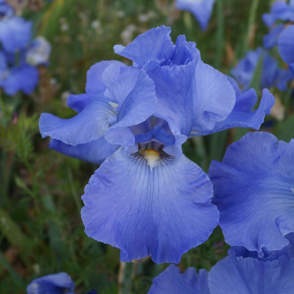 Pétales et sépales bleu moyen pur, contours légèrement ondulés, barbe blanche.