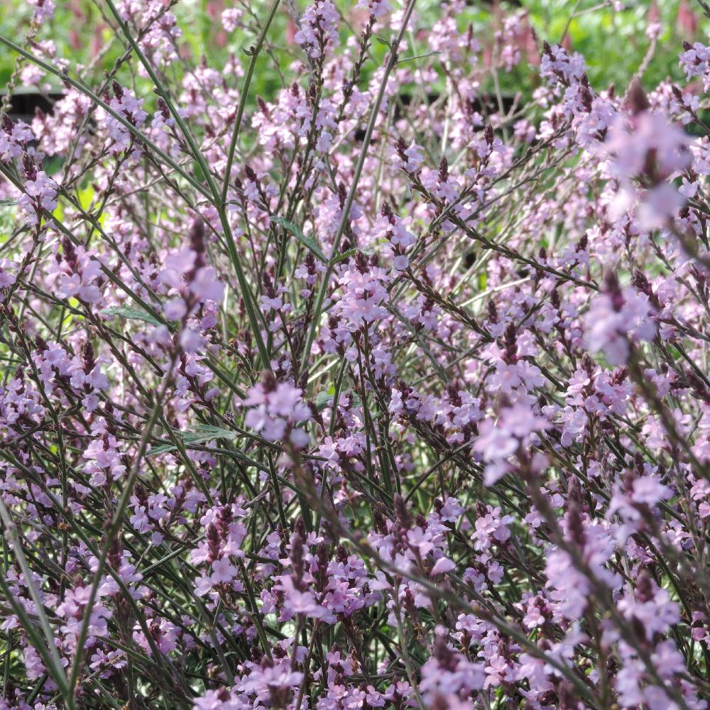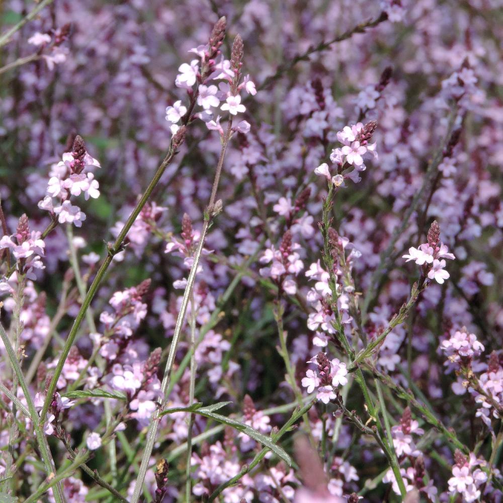 La verveine officinalis var. grandiflora 'Bampton' est une variété de grande taille, remarquable pour son joli feuillage vert pourpré. Sa floraison est aérienne tout en délicatesse, elle produit des centaines de petites fleurs roses, sur de longs et fins épis violet pourpré. Cette vivace a une durée de vie relativement courte mais se ressème spontanément (prenez gare à ne garder que les plants pourpres, ressemblant au pied d’origine).