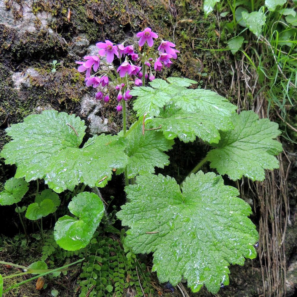 Vivace alpine de sous-bois ou rocaille humide. Rosette de feuilles arrondies et dentées, pétioles velus. Fleurs rose violet, en forme de cloches retombantes.