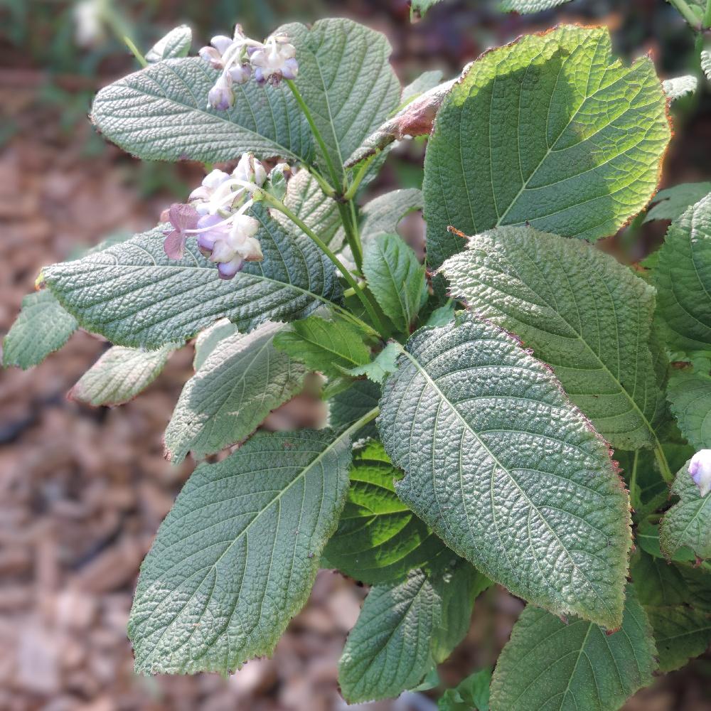 Ressemble à l’Hortensia. Touffe buissonnante dense, grosses feuilles vertes, ovales et dentées. Panicules de petites fleurs en forme de coupe, bleu violacé.