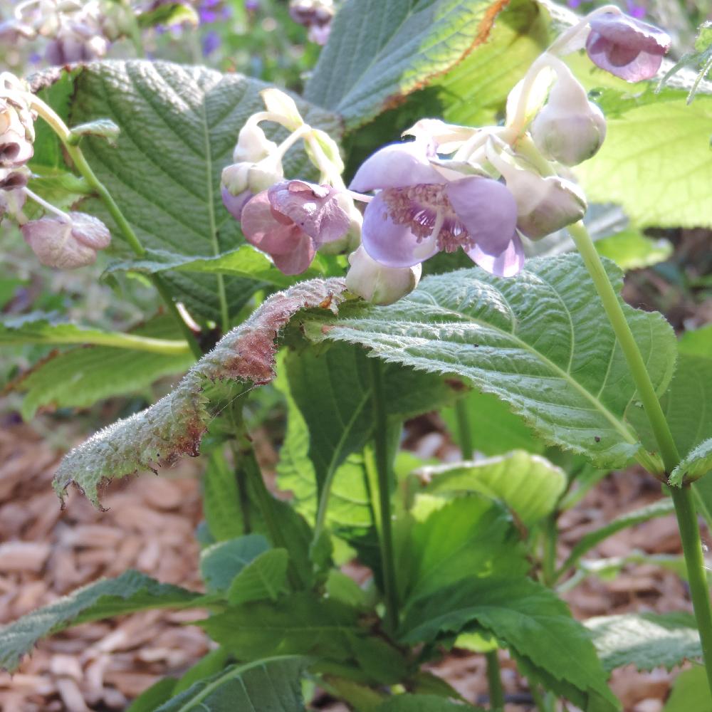 De la même famille que les hortensias, les DEINANTHES sont beaucoup moins connus, bien que tout aussi ornementales. L’origine grecque de son nom signifie « fleurs étranges ». D’étonnantes fleurs en coupe pendante, aux pétales charnus et aux nombreuses étamines, sont réunies en panicules au sommet des tiges florales affleurant du feuillage dense. Les feuilles ressemblent à celles de l’Hydrangea, elliptiques ou ovales, relativement grosses, très dentées et gaufrées. Vivaces caduques, originaires des forêts d’altitude de Chine et du Japon, elles sont très rustiques mais craignent la chaleur et la sècheresse. A planter en sol frais, riche en humus et non calcaire, à l’abri du vent.