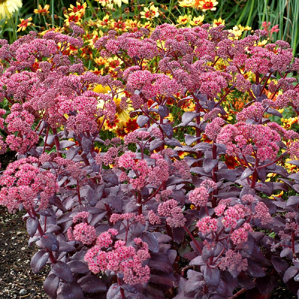 Le SEDUM telephium 'Cherry Truffle' se distingue des autres grands SEDUM par la couleur de son feuillage pourpre foncé et son port compact. Il forme une touffe dense de tiges verticales, portant des couronnes de feuilles charnues et légèrement dentelées. Elles sont nuancées de violet, de noir et de vert, et deviennent noir velouté sous le soleil d’été. Les fleurs rose-rouge apparaissent en cymes terminales juste au-dessus du feuillage pour un contraste parfait.