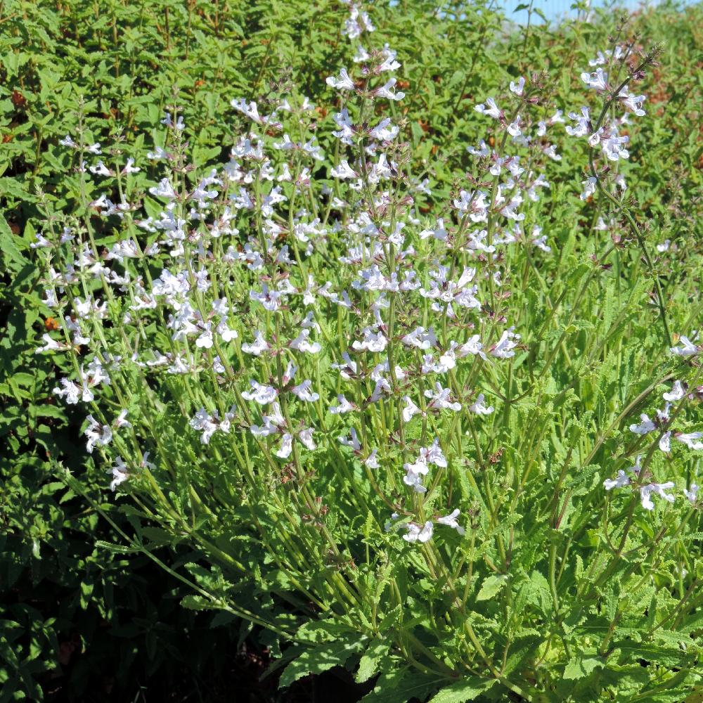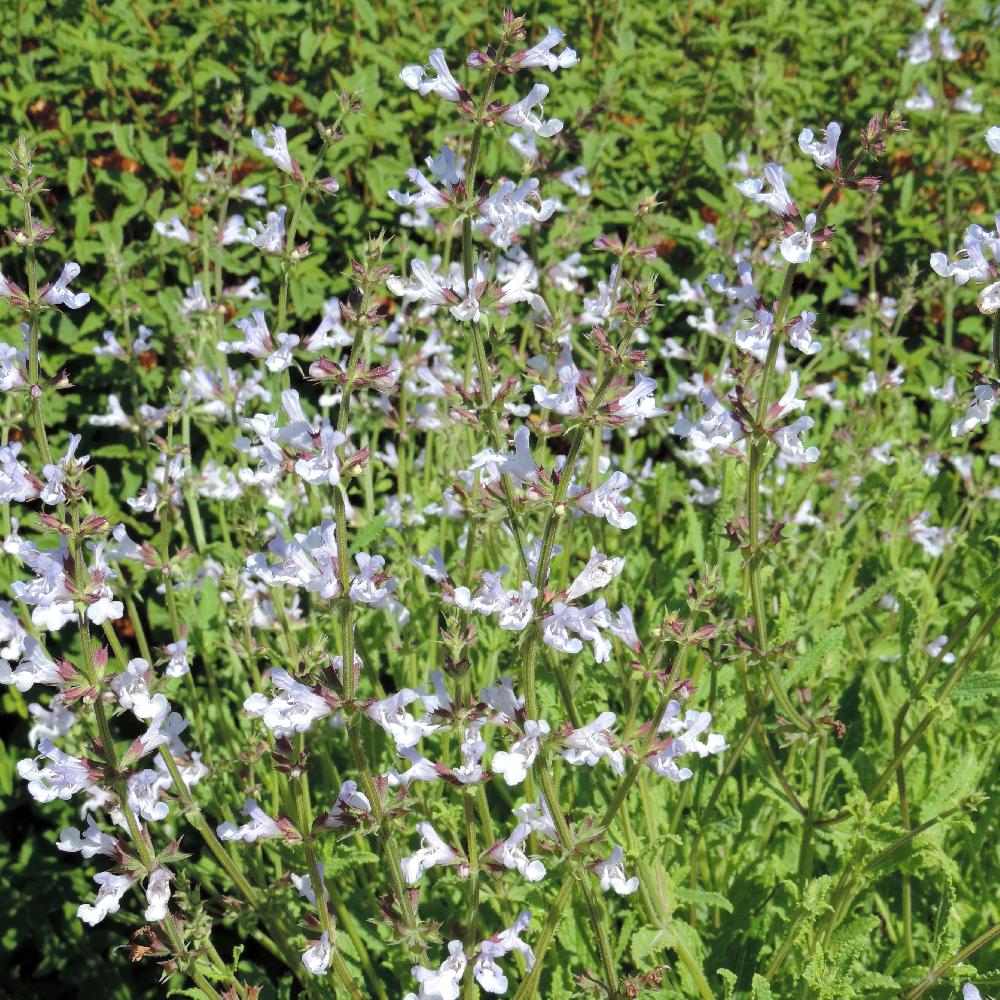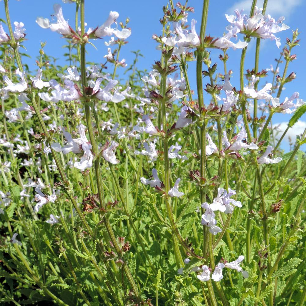 Sauge tapissante, feuillage vert crénelé, fleurs en épis bleu léger au parfum surprenant, rehaussées de calices pourprés.